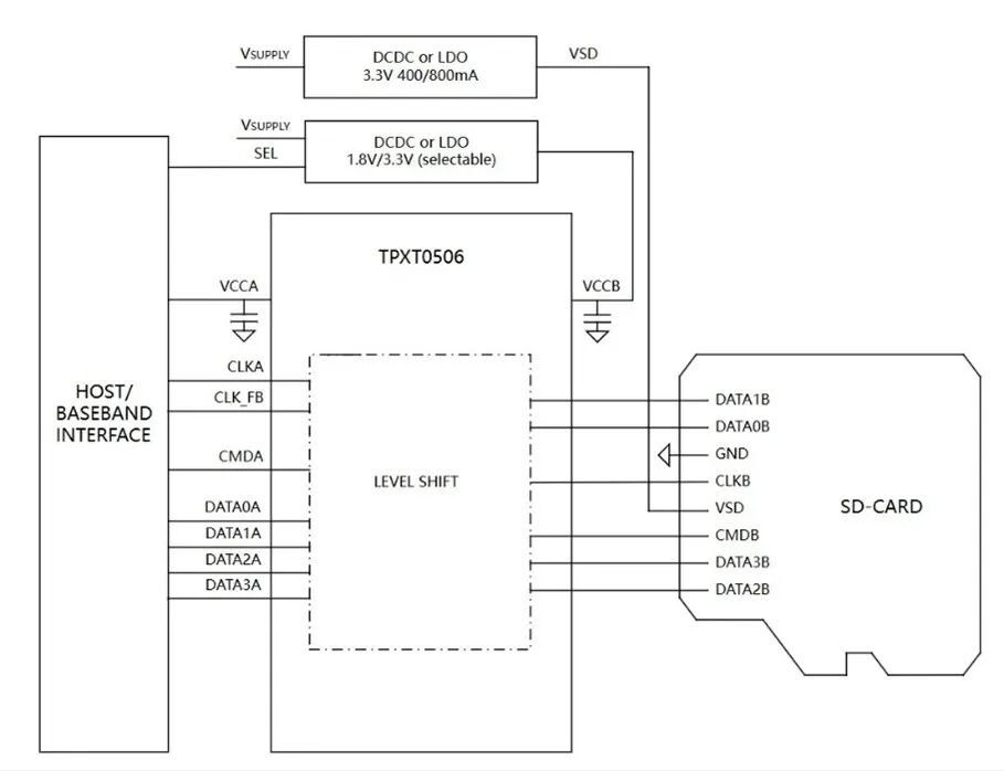 传统方案:应用处理器 → 多颗电平转换芯片 + 方向控制逻辑 + 电源管理 → SD卡座(需要15-20个外围元件)TPXT0506方案:应用处理器 → TPXT0506 → SD卡座(仅需2个旁路电容)