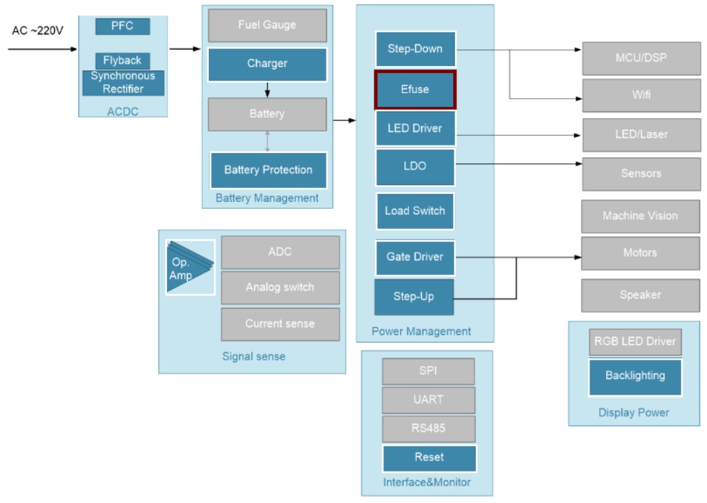 整机运行与功能实现依赖多元化芯片协同,JOULWATT杰华特全系列器件全面覆盖。电机驱动环节,JWH7911B、JWH7915、JWH7924、JWH7917四款驱动芯片,提供稳定驱动能力,适配扫地机器人毛刷、风机等不同电机,确保清洁动力充足;JW7106、JW7107S、JW7112、JW7113、JW7118、JW7124等负载开关与保护芯片,凭借低导通电阻、低静态电流优势,优化功率分配,提供过压、过流、过温保护,保障器件安全。